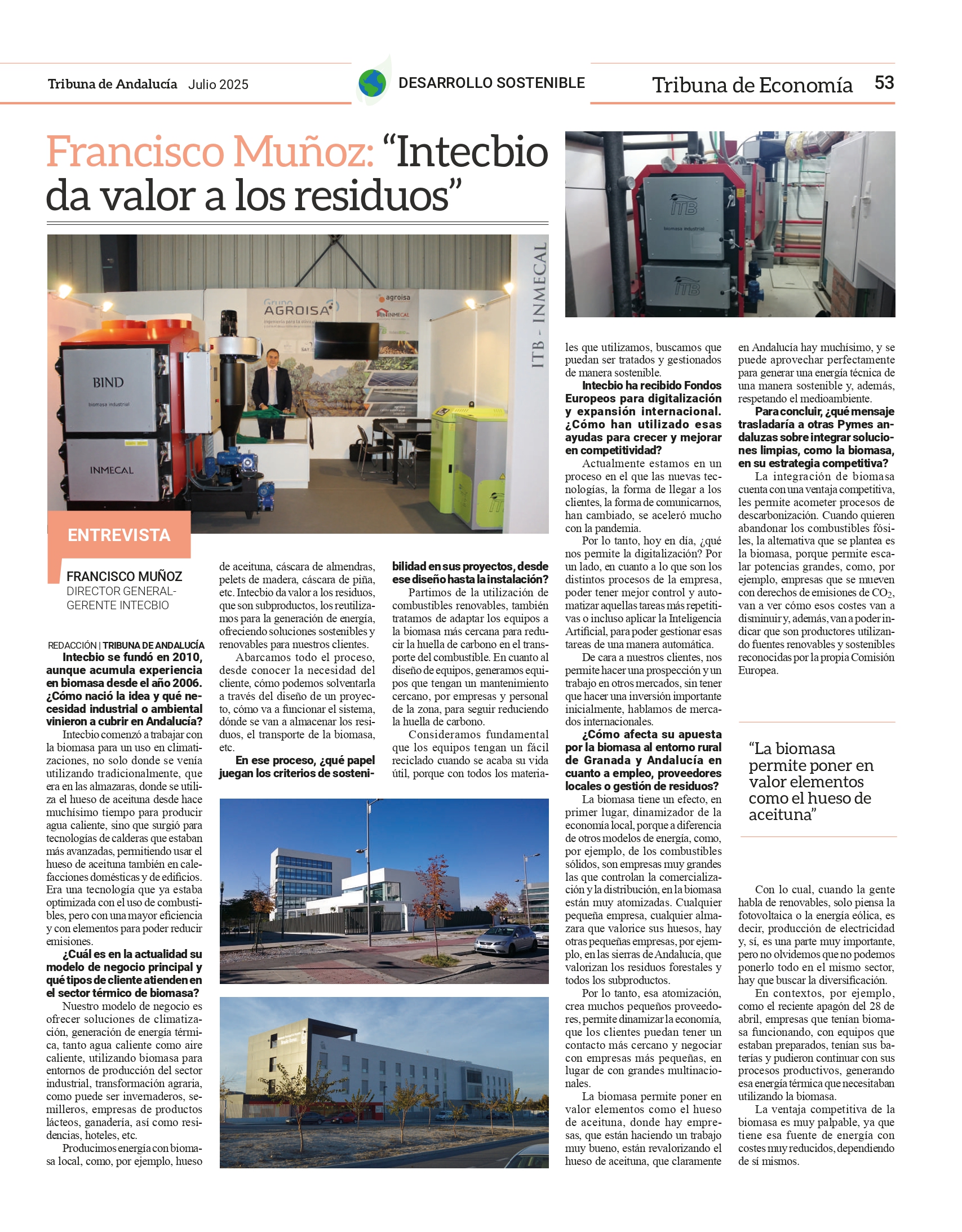 En un contexto en el que la energía y la sostenibilidad marcan la agenda global, en Intecbio seguiremos apostando por soluciones que transformen residuos en oportunidades. Porque creemos que la biomasa no es solo una alternativa: es una vía real, competitiva y respetuosa con el planeta para construir el futuro energético de Andalucía, España y Europa.